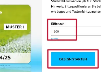 Wählen Sie die gewünschte Stückzahl und ggf. Oberfläche und klicken Sie auf den blauen Button „Design starten“.
