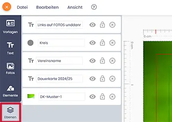 Hier können Sie die Ebenen der Elemente anordnen, sperren, ausblenden oder löschen. Rechts wechseln Sie bei bedruckter Vorder- und Rückseite per Pfeil die Seiten.
