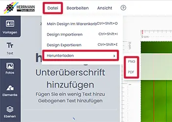 Vor der Bestellung können Sie Ihre aktuelle Design-Datei herunterladen (PNG oder PDF) – zum Ausdrucken und Überprüfen oder für Mitentscheider zur Kontrolle.