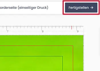 Wenn Ihr Design druckreif ist, klicken Sie rechts oben auf den dunkelblauen Button „Fertigstellen“. Die Druckdatei wird erstellt und an Ihren Warenkorb übergeben.