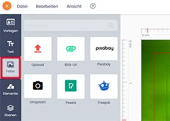 Fotos oder andere eigene Dateien laden Sie über „Upload“ hoch und können diese anpassen oder löschen (rechte Maustaste). Zudem sind Bilder von Pixabay usw. verfügbar.