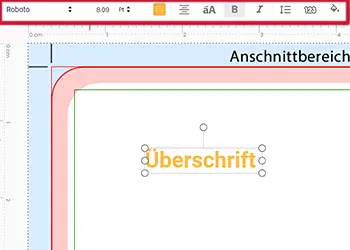 Die Design-Oberfläche ist die „Bühne“ für Ihre Gestaltung. Hier werden auch Maße, Endformat (rote Linie), Anschnitt (hellblau) und Sicherheitszone (hellgrau) angezeigt.